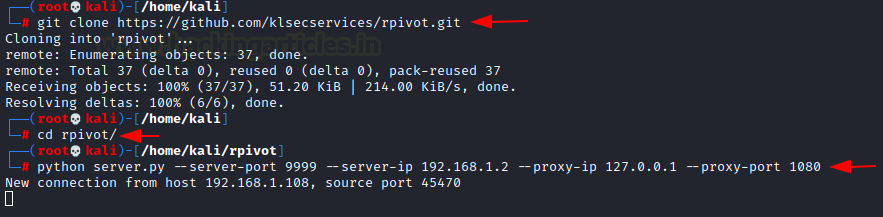 Let’s install Rpivot in the Kali Linux machine. Then go to its directory and start the listener on port 9999, which creates socks version 4 proxy on 127.0.0.1 on a port while connecting with the client