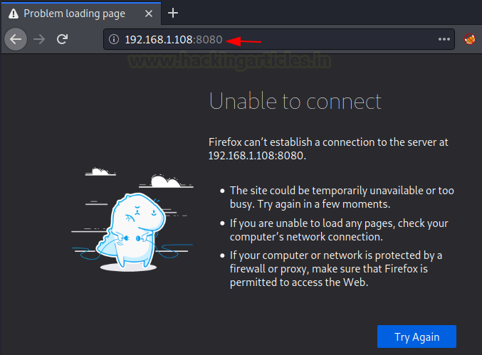 Let’s switch on the Kali Linux machine and check if the webpage is being hosted. However, it shows that the page is unavailable. Therefore, let us explore how we can forward the local address and port to the remote host. This can be done using various methods. So, let’s examine them one by one.
