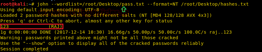 john --wordlist=/root/Desktop/pass.txt --format=NT /root/Desktop/hashes.txt