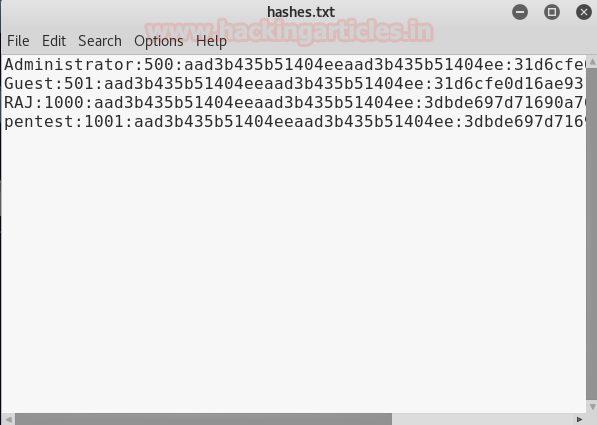 Now copy all hash value in a text file as shown below and save it. I had saved it as hash.txt on the desktop. It contains a hash value of 4 users with SID value as 500: Administrator; 501: Guest; 1001: Pentest; 1000: Raj with their hash password.