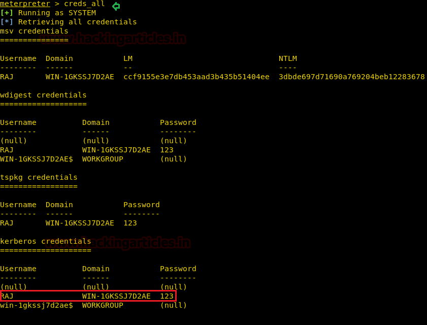 Now run following command which will extract all saved credential of the local user account as shown in given below image, here also we had successfully retrieve password: 123 of user: raj