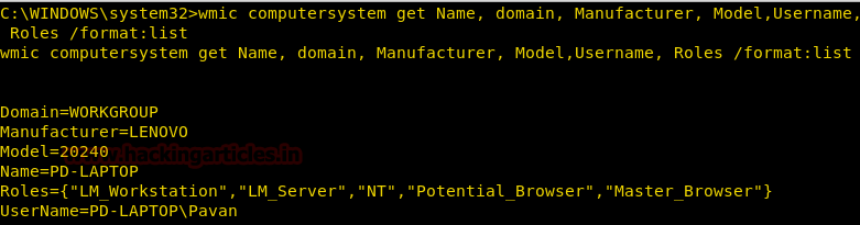 We can enumerate lots of information about the Victim System including its Name, Domain, Manufacturer, Model Number and Much more through the computer system alias of wmic command.
