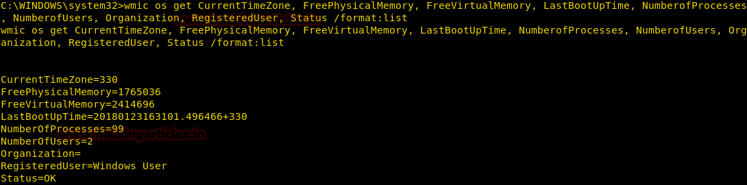 wmic os get CurrentTimeZone, FreePhysicalMemory, FreeVirtualMemory, LastBootUpdate, NumberofProcesses, NumberofUsers, Organization, Registereduser, Status /format:list