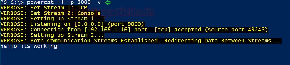 Now in PC-2, we use powercat to connect to PC-1 on port 9000 and send a message through powercat.