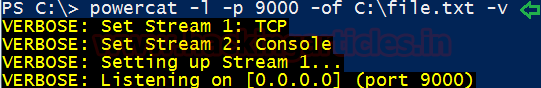 We can also transfer the file using powercat, in PC-1 we setup the listener to accept the file from a remote machine inside the particular path and such as save the files as “file.txt” and therefore run the following command to initiate file transferring via port 9000.