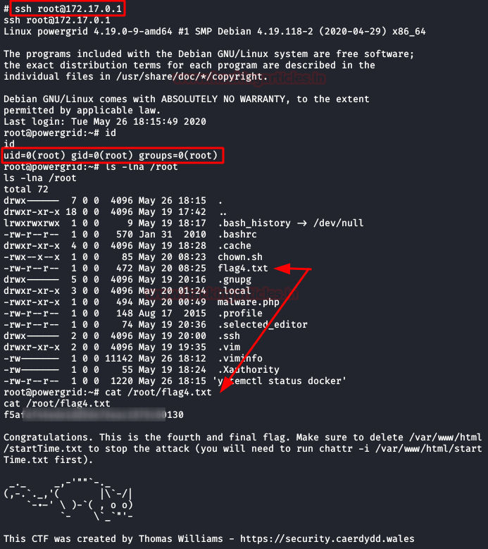 And once being root, we access its folder and read the 3rd flag and the next hint.