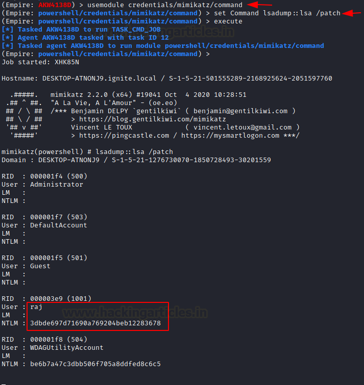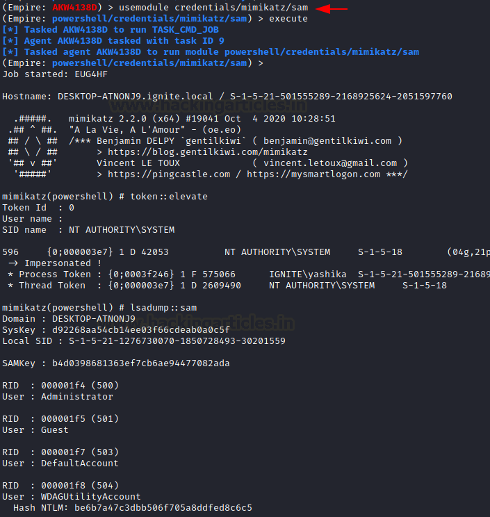 As we saw that there is no shortage of mimikatz modules on PowerShell Empire. But, the Mimikatz is still a big tool with many more attack methods than the Empire team can catch up. So, if you are at the point where you don’t remember any module but you do know the mimikatz command to run, then Empire has you covered. Use the mimikatz/command module to run manual commands directly on the compromised target. To demonstrate, we will be running the lsadump::lsa /patch on the target machine. When run, Mimikatz patches the samsrv.dll running inside the process lsass.exe to dump the NTLM hashes.