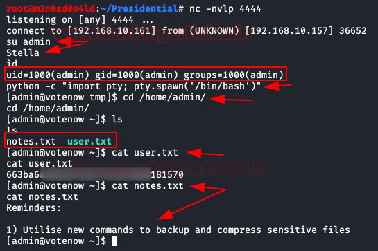 If all goes well, we’ll have a reverse shell. We authenticate ourselves with the credentials of the user “admin“, we use Python to get an interactive shell, we read the flag of “user.txt” and the file “notes.txt”.