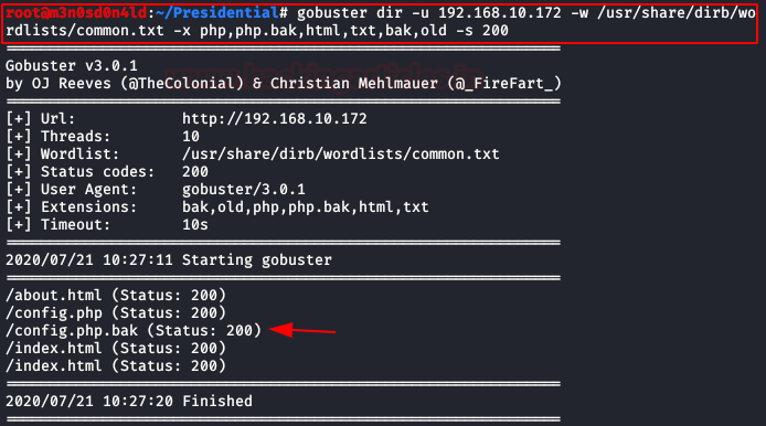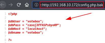 We find a file called “config.php.bak“, these files usually contain database access credentials.