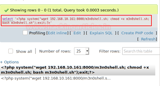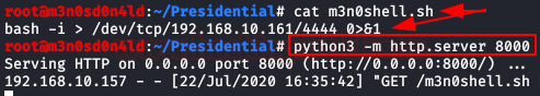 It works! It’s time to complicate it, we will create a file called “m3n0shell.sh” with a reverse shell, we will raise a server with Python and we will execute a sequence of three commands so that it downloads it, gives it execution permissions and executes it.