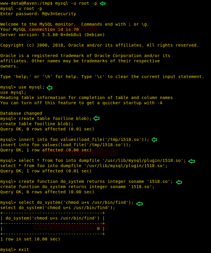 - Exploiting UDF dynamic library vulnerability using an exploit with codename 1518.c on exploit-db