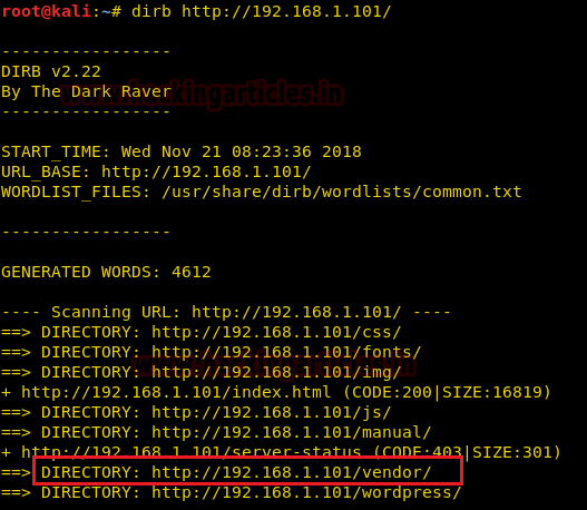 We thought it would be wise to run a directory test before we scan anything else. So we ran a directory buster test to find the “vendor” directory in the victim machine.