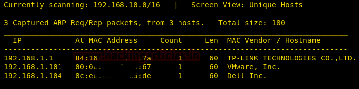 Discovering the active devices on a network using netdiscover and getting the IP address of our victim machine. In this case, the IP address holds 192.168.1.101
