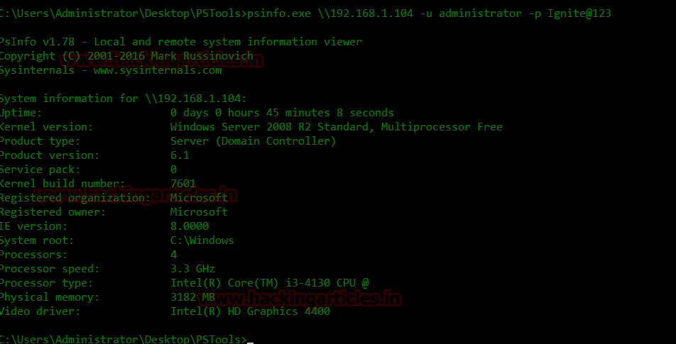 psinfo.exe \\192.168.1.104 -u administrator -p Ignite@123