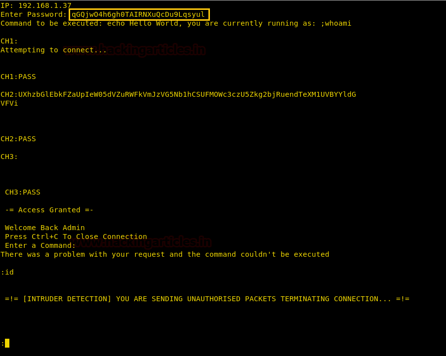 We joined the string and use it as a password for the application. After giving the password, we successfully able to login, and find that we can run commands. But when we type a command we get an error stating that we are sending unauthorized packets and the connection gets closed.