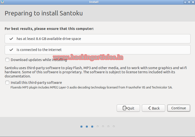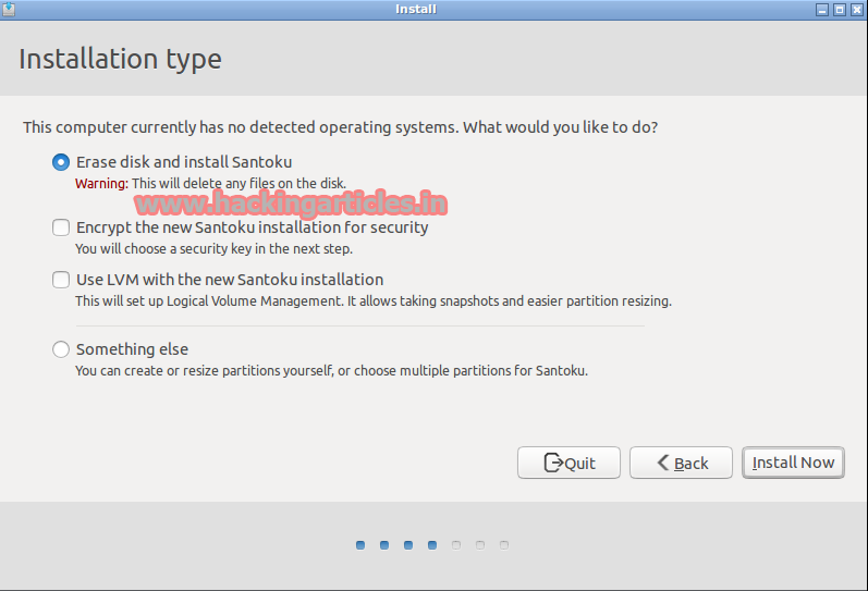 Select first option – Erase disk and install Santoku, then click on Install Now