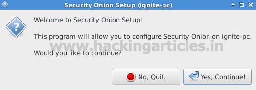 Now once it restarts, again click on “setup” icon for further configuration of security onion setup as a real-time machine. Then click “yes, Continue”.