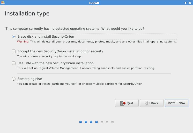 Choose the radio button for “Erase the disk and install Security Onion” to begin installation and click “Install Now”
