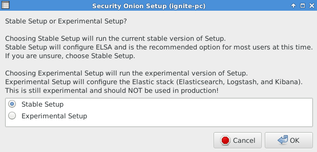 Select “Stable setup” which will configure ELSA; then Click OK.