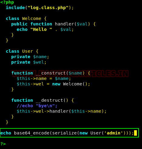 After carefully analysing the code of file index.php and user.class.php, we came to know that we can try to get base64 encoded value of cookie user by just adjusting a function call from index.php to user.class.php. So, we added one single line in the end to display the base64 value encoded in a similar format as the user cookie value but this time with another user i.e. admin.