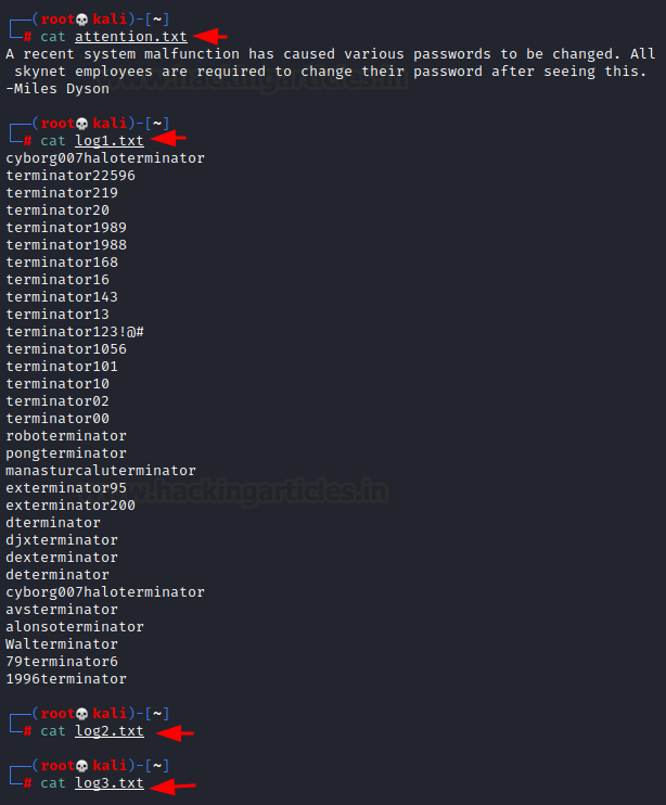 The attention.txt file reads that there has been a recent system malfunction that caused various passwords to be changed. It requests all the employees to change their passwords. The log files log2 and log3 were empty and log1 contains a list of possible passwords related to the Terminator Movie Franchise.