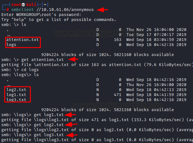 smbclient //10.10.61.86/anonymous ls get attention.txt cd logs ls get log1.txt get log2.txt get log3.txt