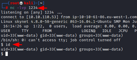 As soon as the exploit is executed, we get a shell on our Netcat listener. We use the id command to check the user and group details and found that the shell that we have procured is for the user www-data.