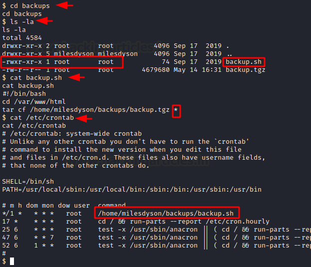 While looking for the user flag, we see that there is a backups directory inside the milesdyson home directory. Traversing inside, we see that it has a shell script by the name of the backup.sh. Reading the shell file, we see that it contains a * wildcard. As covered by our Exploiting Wildcard for Privilege Escalation Article, we need to check the /etc/crontab file. We see that the backup shell script is scheduled to execute at intervals of 1 minute.