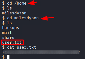We move to the home directory to see what are various users created on the target machine. We see that there is a single user by the name of milesdyson. We found the user flag inside its home directory.