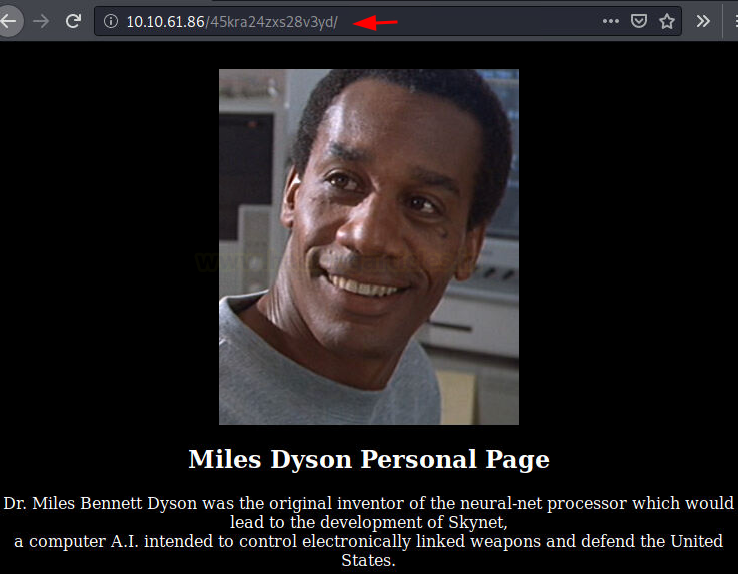 We open the directory mentioned in the important.txt on our web browser and we found ourselves Miles Dyson Character’s picture and a brief introduction. He is the inventor/creator of Skynet. The AI that takes over mankind in Terminator Movie Franchise.