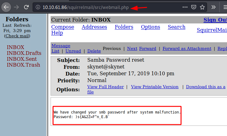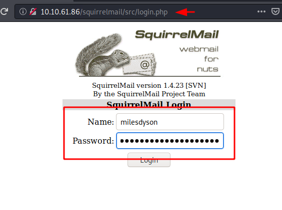http://10.10.61.86/squirrelmail/ Username: milesdyson Password: cyborg007haloterminator