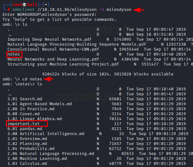 Since we have the password for the private share of the milesdyson, we can use it to enumerate his files shared over SMB. We again use the smbclient to access milesdyson share. Among some pdfs about neural networks and AI, we found a directory by the name of notes. Inside the notes directory, we found some markdown files. Among them was a text file by the name of improtatnt.txt.