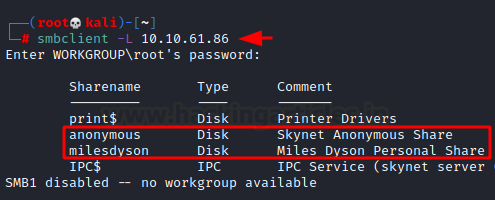 This meant we need to focus on SMB service for any further enumeration. We connected to the SMB service using the smbclient. We found two shares on the machine. Anonymous and Miles Dyson.