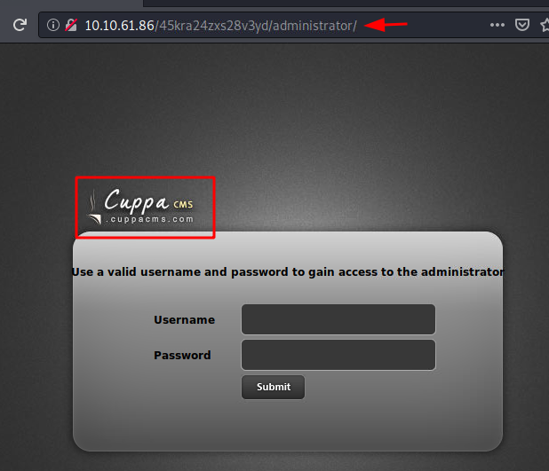 Upon opening the administrator directory in the web browser, we see that it is an instance of Cuppa CMS. We are greeted with a login panel.