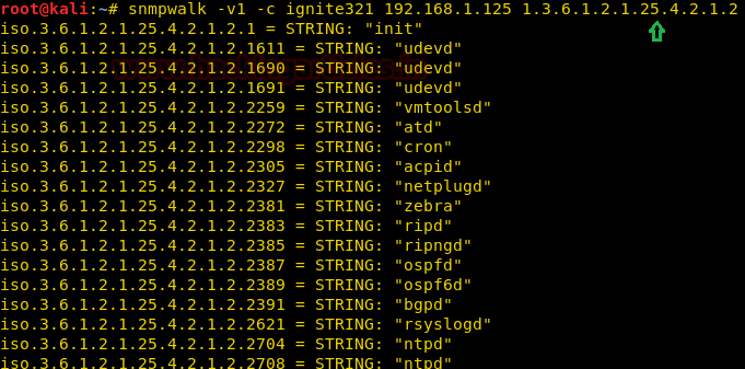 snmpwalk –v1 -c ignite321 192.168.1.125 1.3.6.1.2.1.25.4.2.1.2