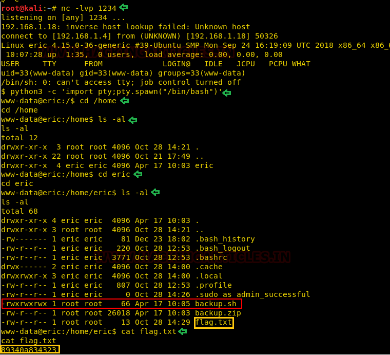 On the other side, in a new terminal, we created a netcat listener at the port that we mentioned the php reverse shell script. Upon Execution, we got the shell of the target system. To get a proper shell, we used the python one-liner. After getting the proper shell, we used the ls command to enumerate for the flag. We traversed in the eric directory. Here we found the 1st flag as shown in the given image. We also found a file named backup.sh. As we can see in the given image that the backup.sh file has all the permission required and it runs as root.