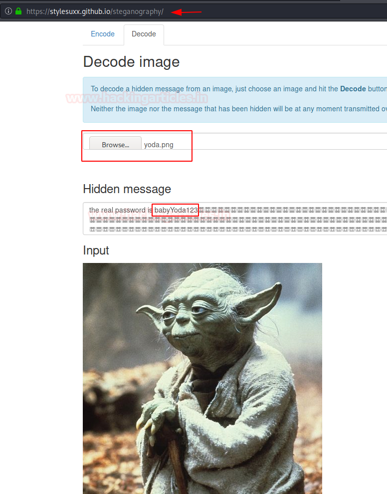 In the source code, the author has given a hint regarding password i.e. “password is here” and below that there is a string of text which indicates that there is a password hidden here somewhere. When nothing worked, we downloaded the image from the main page in the hope that there must be some data hidden behind it by the method os steganography. To use steganography Click the URL https://stylesuxx.github.io/steganography/ and upload the image then click the decoded image for extracting passwords.