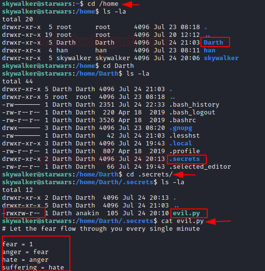 After switching to the home directory, we found a folder named Darth that contains a hidden directory named as .secrets that contain a python file “evil.py”. As you can see in the above image, there is a read and write executable python file, also this file is executing after one minute.