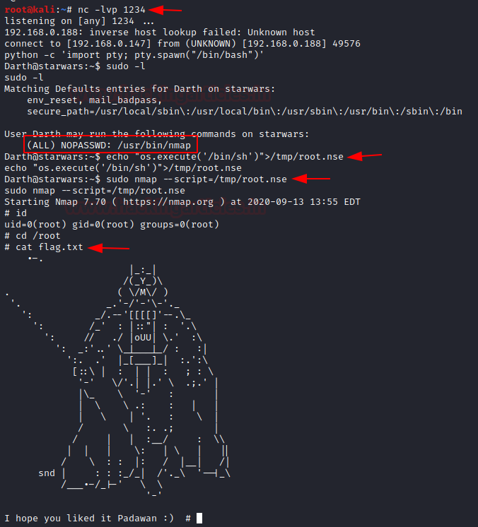 We found that the user Darth own sudo right for NMAP, thus without wasting much time, we write root.nse script inside /tmp to run /bin/bash for root privilege Escalation when executing through nmap.